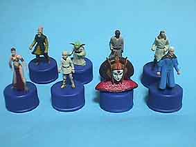 ちまたで中毒患者続出(?)のペプシのボトルキャップです。初めはそんなに興味がなかったのですが、1度買ってしまうともうだめでした。周りにはまとめ買いした人もいると聞いていますが、私に言わせれば邪道ですね。こいつの楽しみ方は、ちょっとずつ買って、何が入っているのかなーと袋を開けてみるのが良いんですよ。でかいアミダラが出た時はうれしかったなー。ほとんどライダーカード状態です。(ちょっと古かったですか?)