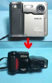 今私が使っているデジカメはSONYのデジタルマビカのMVC-FD5で、フロッピーは画像の整理や扱いに便利なのですが、時代遅れの35万画素でマクロのピント合わせは手動と、非常に不満であります。ということで、いま新デジカメを物色中です。手に入れたあかつきには、すばらしい画像をお届けできることでしょう。(ほんとか?)でも、同じぐらいの値段でパソコン買えちゃうんだよなー。こっちもそろそろ買えどきかなって感じで、迷ってしまいます。