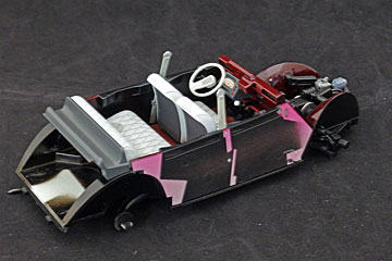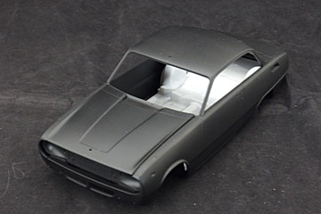 パーティングラインを消して黒のサーフェイサーを吹いたところ。レストアで言う「ドンガラ」の状態。最近の私の作り方はすべてこの状態から始まります。 |