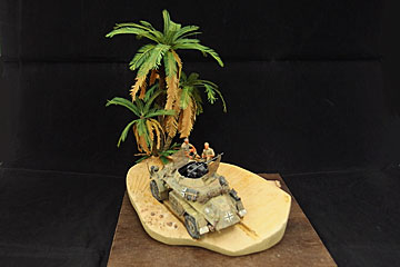 学ぶ事は真似る事からと言う言葉を信じて「アドバンスグランドワークス」の砂漠のジオラマを参考に作成しました、メイン?のヤシの木は紙創りさんのを購入して作成しています。 |